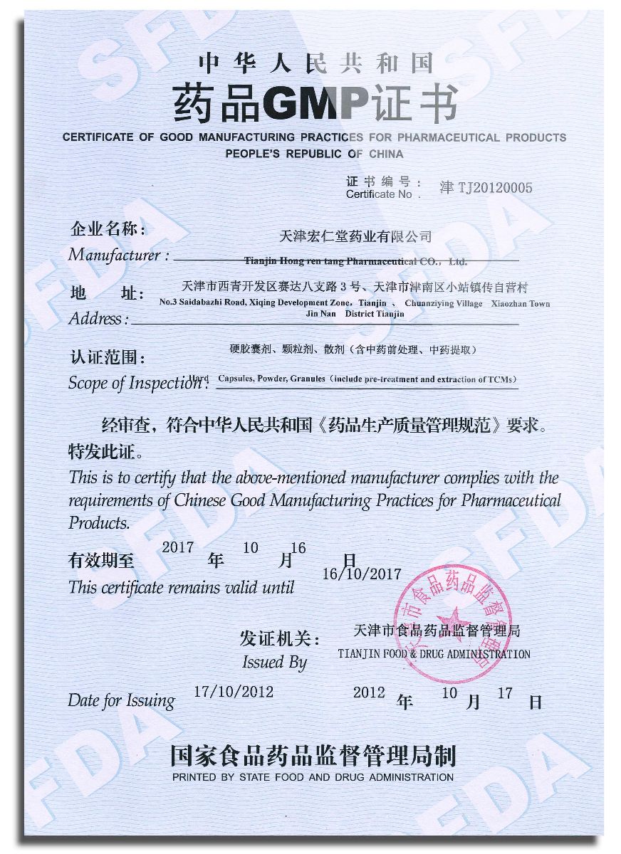 2012年10月17日,天津宏仁堂藥業(yè)有限公司正式取得了中華人民共和國《藥品GMP證書(shū)》,成為我市首家通過(guò)新版GMP認證的中藥制藥企業(yè)。